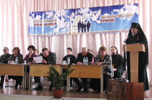 Наместник Псково-Печерского монастыря архимандрит Тихон (Секретарев), открывая пленарные слушания, привел данные из доклада Патриарха Кирилла на Рождественских чтениях-2011: абсолютное большинство (78%) родителей, чьи дети участвуют в эксперименте по изучению Основ религиозных культур и светской этики, относятся к преподаванию этого предмета в школе положительно. Наместник подкрепил статистику личным воспоминанием, как в обитель (17 июля 2007 г. – ред.) в день своего рождения приезжал с неофициальным визитом министр образования и науки РФ Андрей Фурсенко. «Находясь в Богом зданных пещерах, у места погребения столетнего старца, исполнившего заповедь о почитании родителей, я сказал министру: никогда нельзя забывать, что главные заказчики образования – родители, и к их голосу надо прислушиваться. Хорошо, что в законе есть пункт о том, что основы православной культуры преподаются по желанию и родителей», – отметил архимандрит Тихон.
